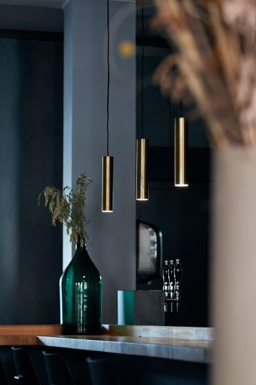 I indretningen har vi fokuseret på at skabe hygge i nordisk stil. Vi har bevaret en murstensvæg i den gamle bygning og resten af rummet er holdt i grå nuancer med panelvægge, der er med til at skabe en hjemlig stemning.