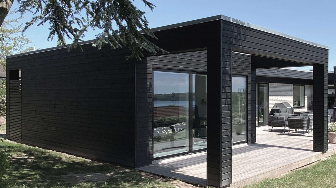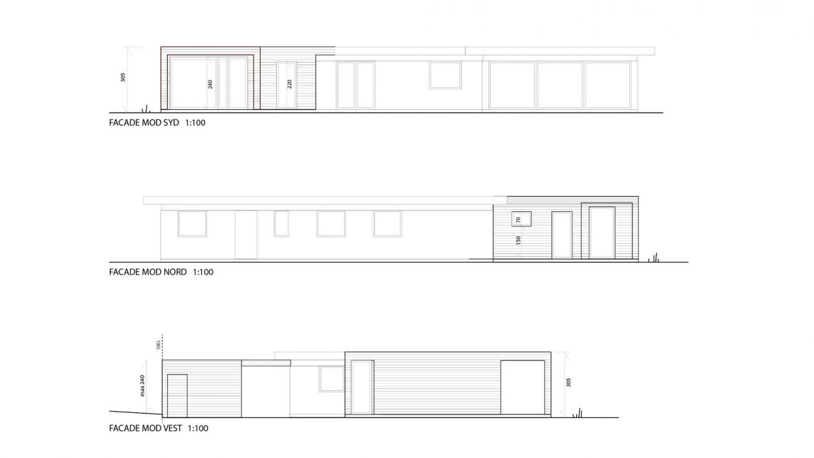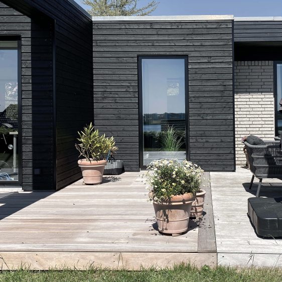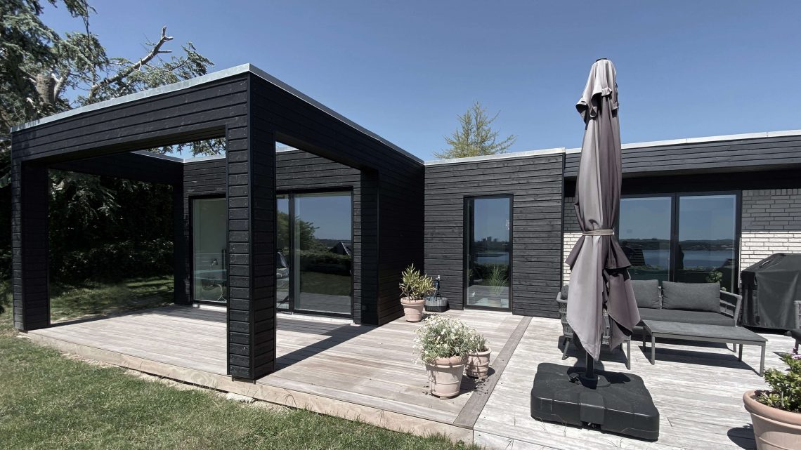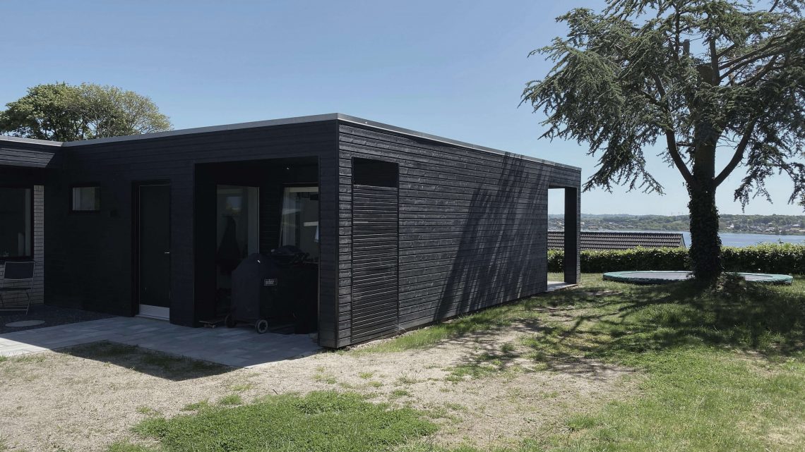 Den hvide murstensvilla fik en tilbygning i sortmalet træ, der præcis som den eksisterende bolig vender blikket mod fjorden. Sammenhængen mellem den gamle og den nye bolig er etableret ved at videreføre det flade tag, og det sorte træ fra sternen er blevet det dominerende materiale i tilbygningen.