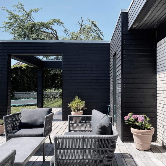 Præcis som den hvide udsigtsvilla danner tilbygningen også en vinkel, så der skabes en atriumgård med en dejlig stor terasse mellem de to dele af huset. Den nye vinkel rummer et indrammet udendørs opholdsareal, hvor man sidder lidt afskærmet fra atriumgården gennem forskydningerne i tilbygningen i forhold til den eksisterende bolig.