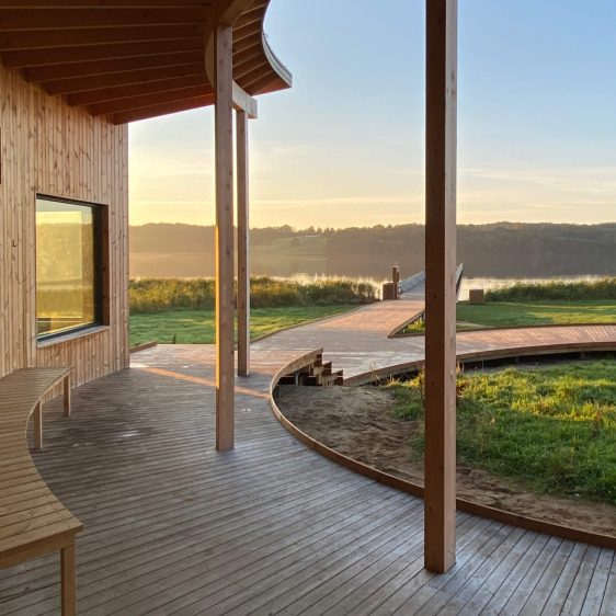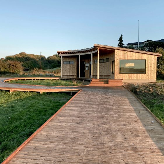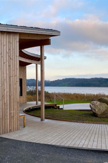 Vi har skabt en bygning, der også rummer mulighed for udendørs ophold for alle, der besøger fjorden for at nyde naturen i al slags vejr. Den cirkulære bygning er bygget i træ og med et skrånende tag, så den falder i ét med den omkringliggende natur. Arkitekturen er enkel og præcis i gode materialer, der patinerer på smukkeste vis.