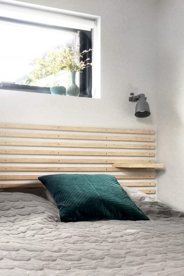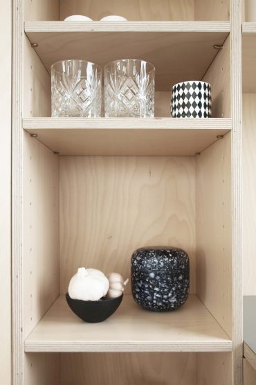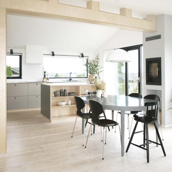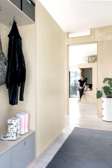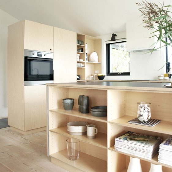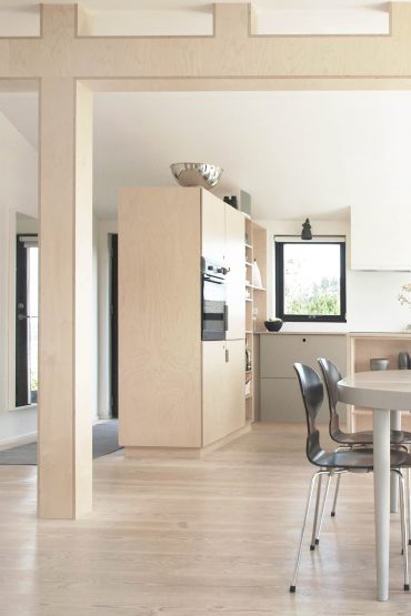 Krydsfiner er anvendt som et gennemgående element i huset, flere steder i form af specialfremstillede møbler: et entremøbel til opbevaring, køkken og ikke mindst den hyggelige alkove i stuen, som især husets yngste beboere nyder at hygge sig i. Brugen af samme materiale i flere af rummene sikrer en god sammenhæng i hele huset.