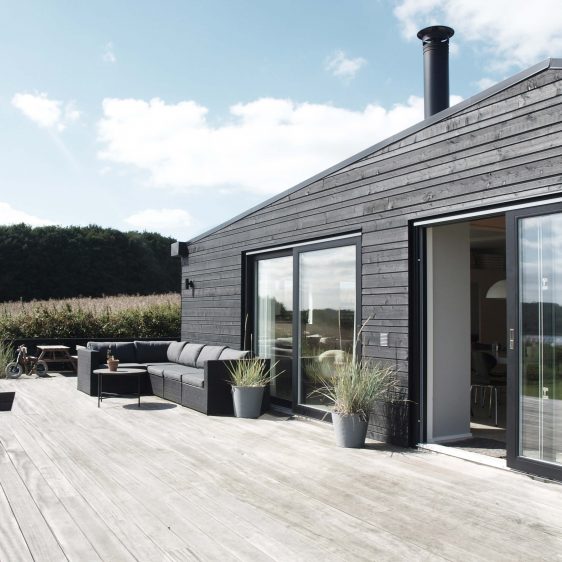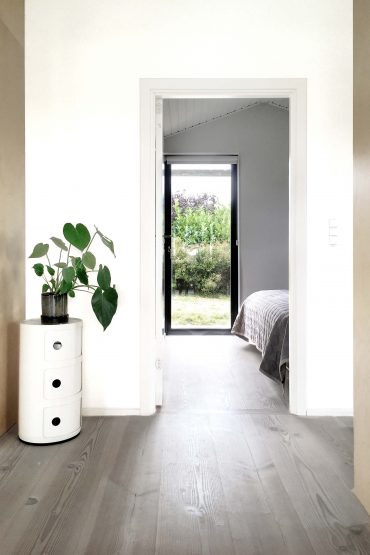 Det eneste, der i dag står tilbage af det oprindelige sommerhus, er konstruktionen i form af tag og ydervæggene, som nu er beklædt med sortmalet træ og har fået nye flotte vinduer. Indvendigt er der skabt et moderne hus med brede plankegulve i douglas, og væggene er malede i hvide og grå nuancer.