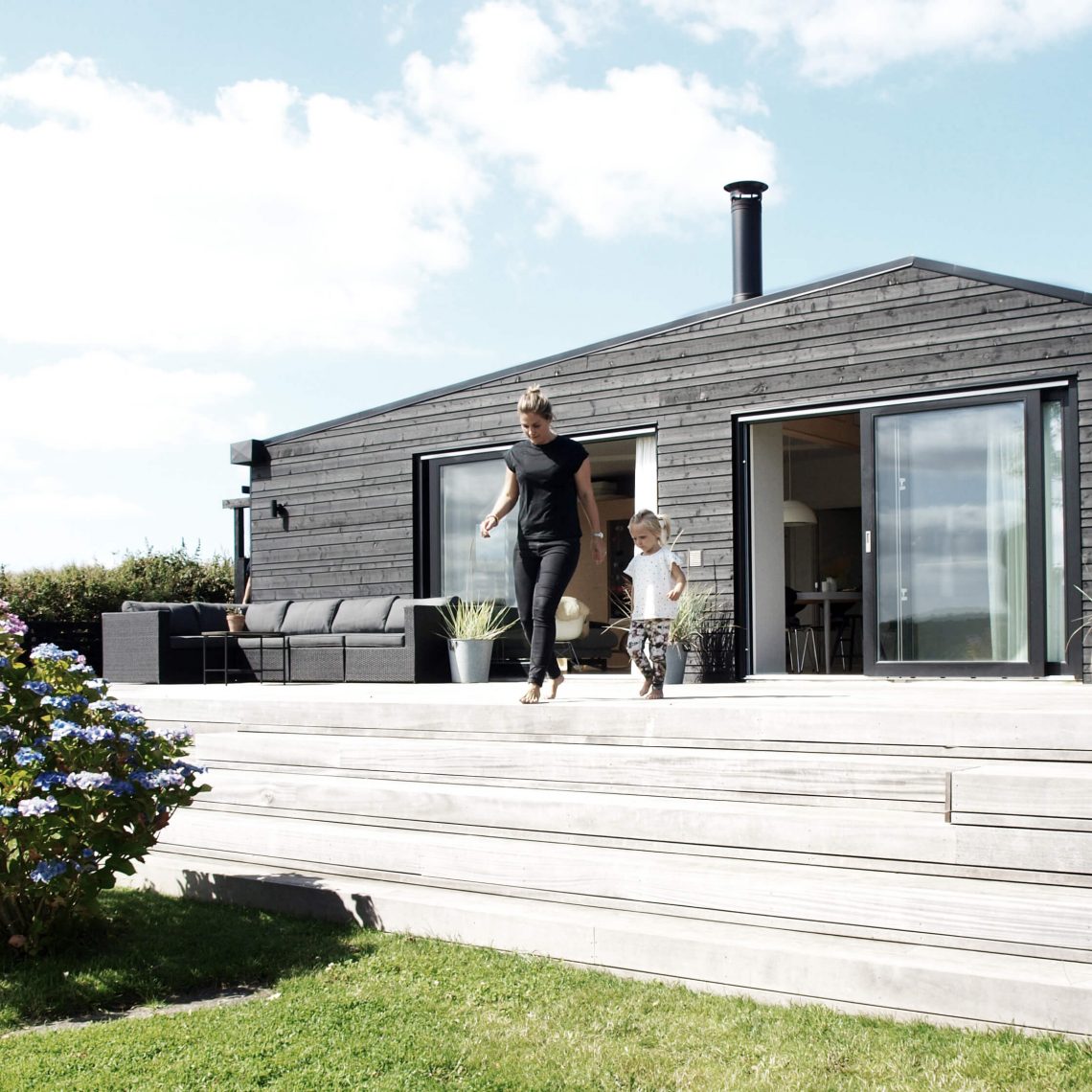 Den nye træterrasse er etableret hele vejen rundt om huset og mod syd kan familien nyde udsigten over fjorden.