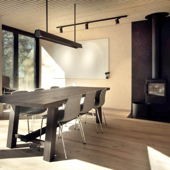 Indvendigt er væggene beklædt med birkefiner, så naturen kryber med indenfor i en smuk og lidt forfinet udgave, der klæder den enkle og rå hytte. Omdrejningspunktet i indretningen er mødebordet i sortlakeret ask, som er skabt til brandet sammen med pendlen over bordet.