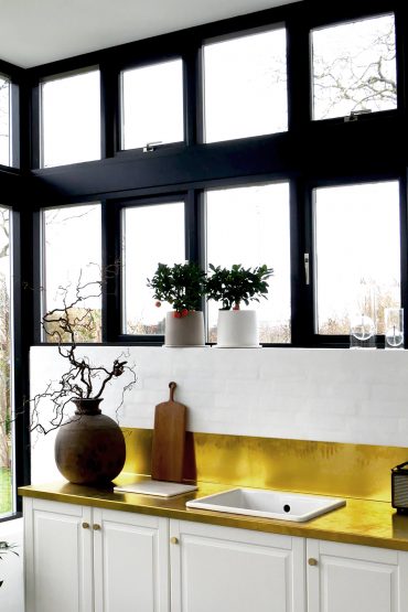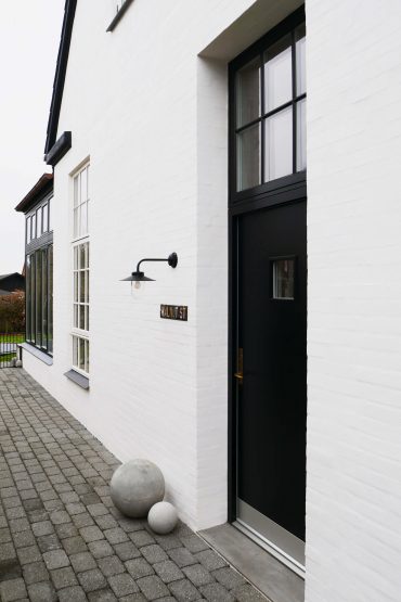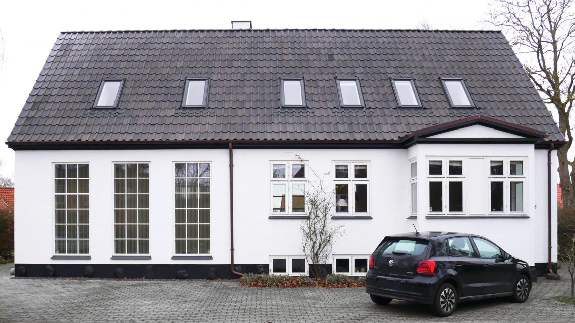 Det lille, fine murermesterhus har fået vokseværk med en tilbygning, der er i samme smukke stil som huset. Øjet ville ikke umiddelbart ser forandringerne, hvis det ikke var for tilbygningens høje, sprossede vinduer. Tilbygningen rummer familiens virksomhed, hvor der er god plads til både kontor og showroom.