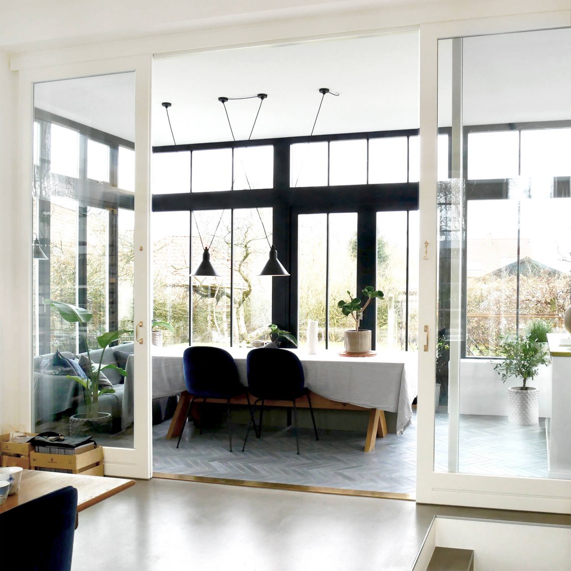 Indvendigt er tilbygningen forskudt i forhold til stueplan i det eksisterende hus, så der er skabt et nyt smukt rum med højt til loftet. Tilbygningen består også af et flot orangeri på havesiden, der trækker lyset ind i boligen og forlænger sommeren.