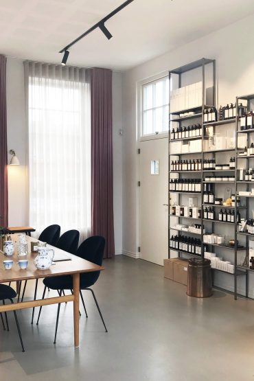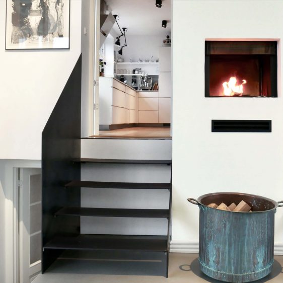 Showroomet ligger adskilt fra den private bolig, men i smuk kontakt med en enkel trappe i stål og en hyggelig brændeovn, der kan ses fra begge sider.