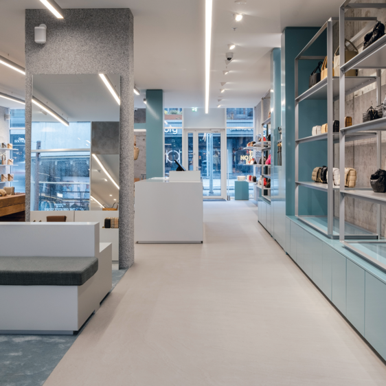 Butikkens niveaudeling skaber en naturlig fordeling mellem tøjet til piger og drenge og forenes i et stort åbent fælles prøverum. Kælderen er indrettet med spejleffekter og fleksibelt inventar, så det kan tilpasses sæsonens varer og bruges til events.